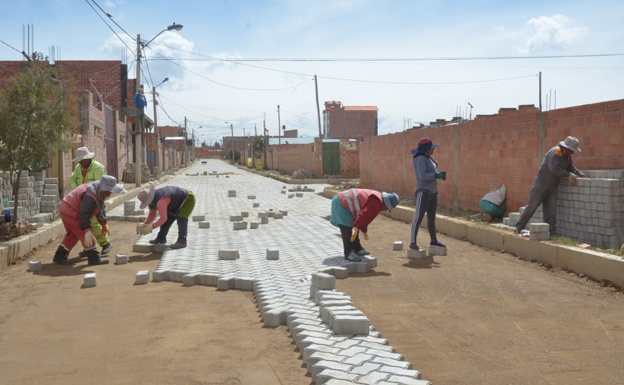 Dos obreras lideran el enlosetado de la calle 16 de Julio de la zona Virgen del Carmen del Distrito 8, ellas son Reyna Sirpa y Maruja Rodríguez que dirigen las cuadrillas de la Alcaldía de El Alto y cada jornada organizan y supervisan el avance de obras que fueron divididas en dos tramos; una fue concluida y el otro tiene un 38 por ciento de avance.