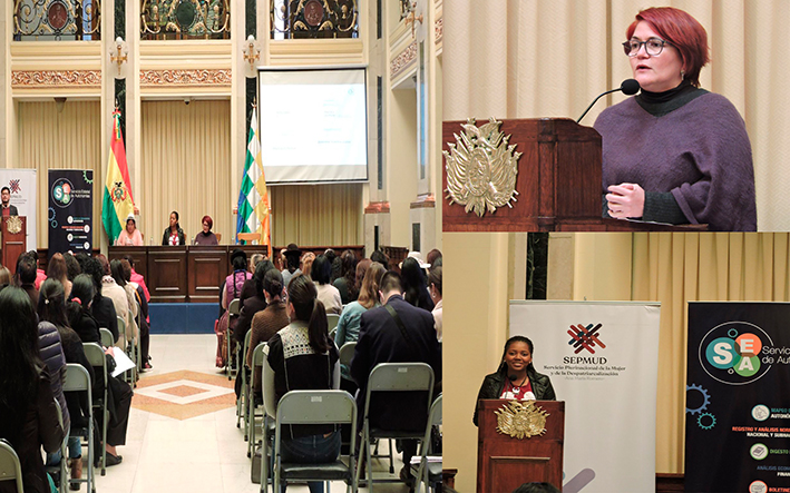 Este trabajo fue presentado por la directora del Servicio Estatal de Autonomías (SEA), Claudia Peña, y la autoridad del Servicio Plurinacional de la Mujer y de la Despatriarcalización (SEPMUD), Wendy Pérez.