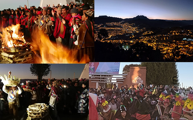 Cuando las manesillas del reloj marcaron las 06.00, el tumulto de asistentes, le dieron rienda suelta a la algarabía en medio de minutos de música, ritual y concentración donde la alcaldesa Eva Copa acompañada de sus más estrechos colaboradores se concentró y aprovechó para pedir pidió salud y bienestar para la población.