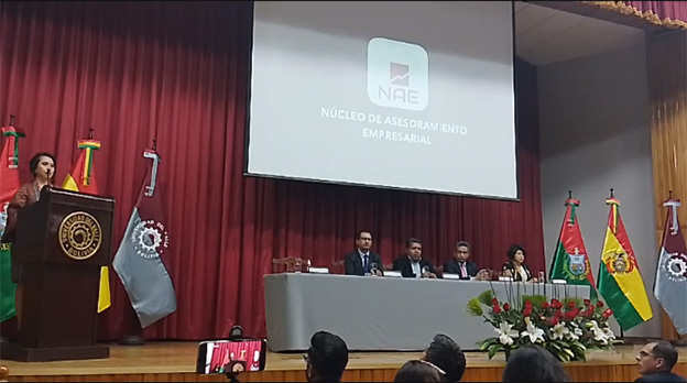El acto de presentación del proyecto NAE se realizó en el Paraninfo de Univalle donde estuvieron como invitados especiales el viceministro de Microempresa Nelson Aruquipa, el vicerrector de Univalle La Paz Franklin Néstor Rada y el vicepresidente de la Federación de Empresarios Privados de La Paz Sergio Siles Sánchez, además de estudiantes, empresarios y la comunidad universitaria de la Superior casa de Estudios.
