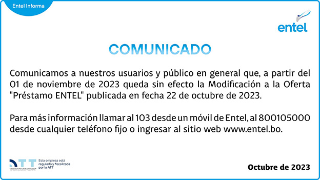 Para mayor información se podrá consultar llamando al 103 desde un móvil de Entel o al 800105000 desde cualquier teléfono fijo o ingresar a la página web: www.entel.bo, finaliza el comunicado.