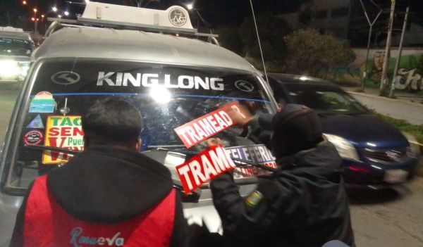 El equipo de Cusi pegó al menos seis stickers de ‘TRAMEADOR’ a minibuses que no cumplían su recorrido completo y por el cual, los usuarios pagan Bs 1,50.