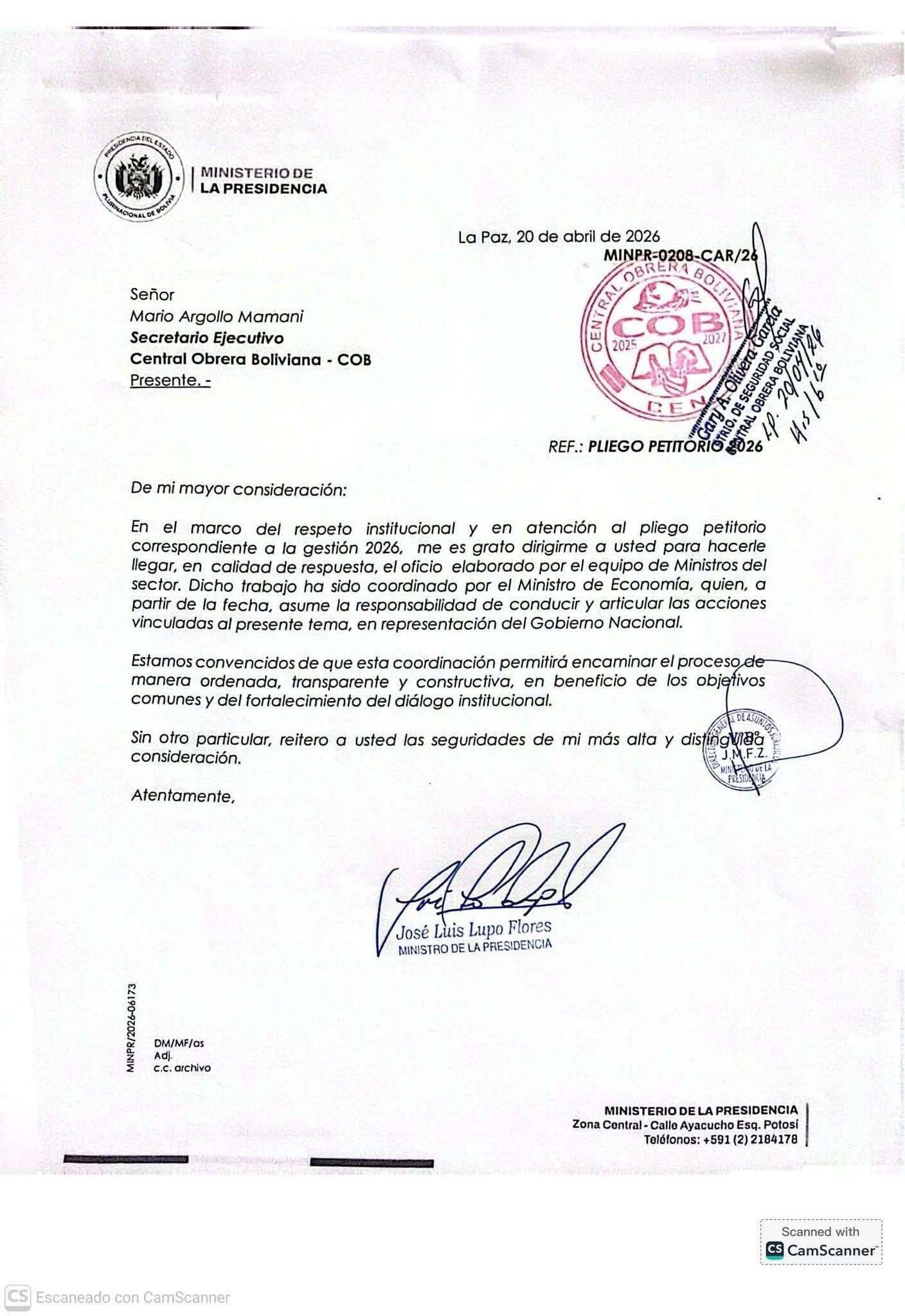 Además, varias demandas económicas, sociales y productivas planteadas por la COB fueron observadas o rechazadas por el Ejecutivo, profundizando el desacuerdo entre ambas partes.